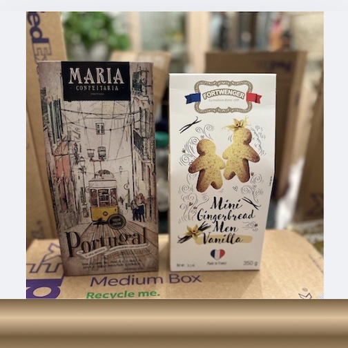 One box is from Portugal, the other Is from France. The one from Portal is apples and cinnamon. The second from France are Vanilla but not just Vanilla Cookies. They're Gingerbread Men for the holidays! Unusual and fun for this time of the year!